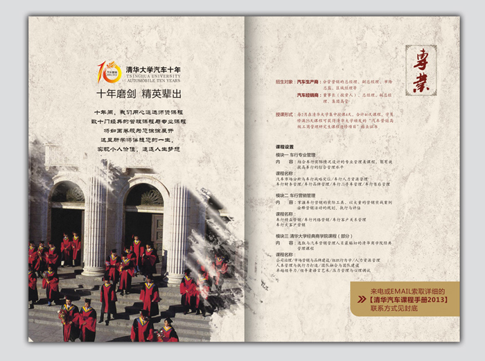 项目简介: “清华大学汽车营销高级工商管理课程班”自2003年推出至今,历经十年锤炼,已成功举办了21期课程班。来自全国30个省市及港台地区的中国汽车行业高管在此学习、交流,构成了国内强大的汽车厂商和经销商网络。该班得到了业界的广泛认可和推荐,是中国汽车精英提升自我的首要选择。 秉承“卓越品质、行业第一”的办学理念,清华大学不断奉献高质量的课程、教学管理和服务,旨在为中国汽车业造就世界一流CEO!